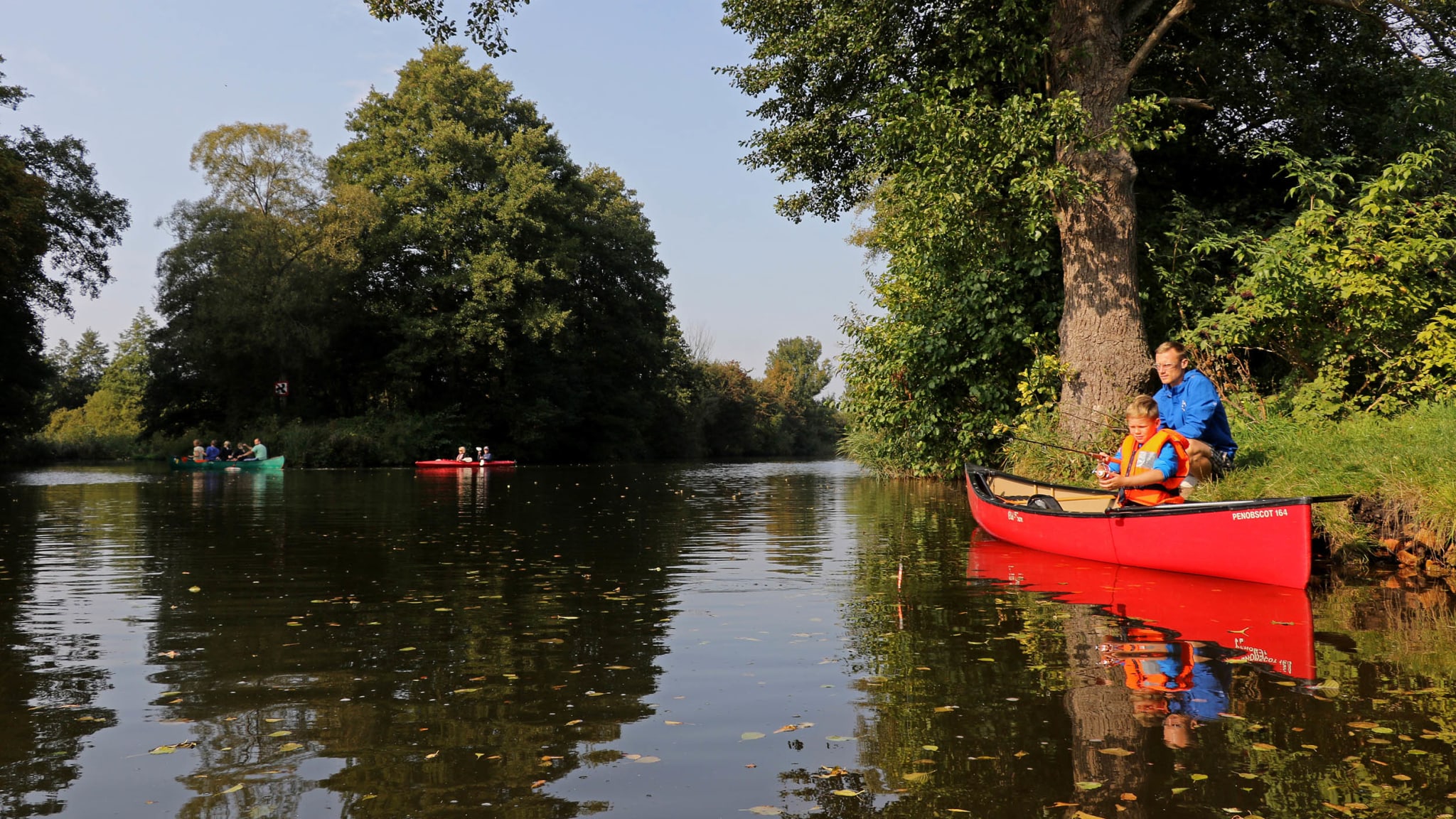Hier fliesst alles ganz langsam. Das Wasser und die Zeit. Bei einem kleinen Abstecher zu den Bootshäusern auf dem Woblitzsee erleben wir, wie die Herbstsonne Kraft sammelt und durch den Dunst bricht. Wir lassen die Paddel ins Wasser hängen und treiben ein Stück auf den stillen See hinaus. Wir sind ganz nah dran – am See, der Entenfamilie, den Fischen, die wir bequem vom Boot aus beobachten können.