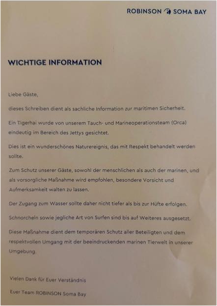 In den üblichen sozialen Medien, die mit F anfangen und mit acebook aufhören wird berichtet, dass das Orca Team am Steg vom Breakers einen Tigerhai gesichtet hat. Kiten, Schwimmen und Schnorcheln ist nicht, Tauchen weiterhin möglich.