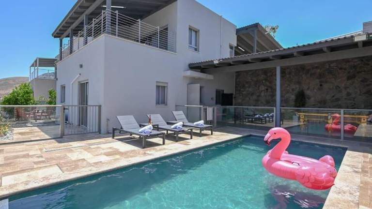 Die Villa umfasst fünf Schlafzimmer, ein Wohnzimmer, eine komplett ausgestattete Küche mit Kühlschrank und Kaffeemaschine sowie drei Badezimmer mit Dusche und Badewanne. Handtücher und Bettwäsche werden bereitgestellt. Der Innenraum bietet Platz für eine angenehme Aufenthaltsqualität und ist ideal für Familien eingerichtet.