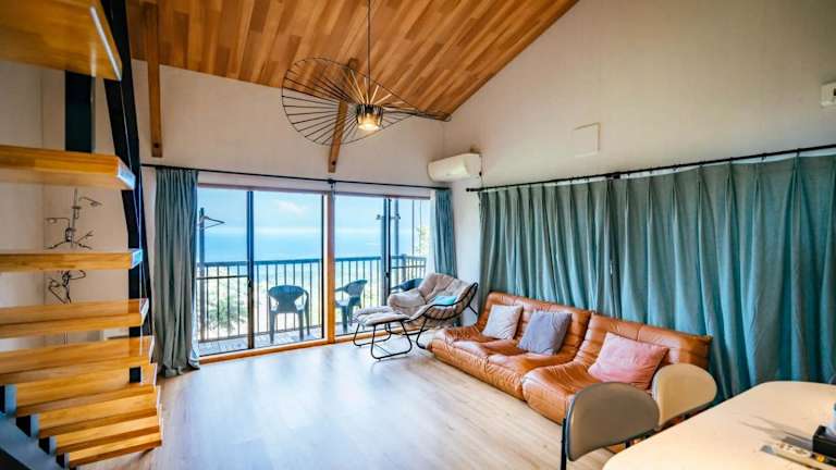 Die Ferienwohnung 熱海伊豆 絶景リゾート 初島 zu臨む モダンデザイン bietet einen herrlichen Blick auf die Berge und überzeugt durch eine moderne Gestaltung. Sie verfügt über eine Terrasse und einen Balkon, die zu einem entspannten Aufenthalt einladen.