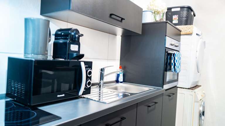 Die Wohnung verfügt über ein Schlafzimmer sowie eine Küche, die mit einem Kühlschrank und einem Ofen ausgestattet ist. Ein Flachbild-TV und ein Sitzbereich sind ebenfalls vorhanden. Das Badezimmer ist mit einer Dusche ausgestattet, und Handtücher sowie Bettwäsche werden zur Verfügung gestellt.