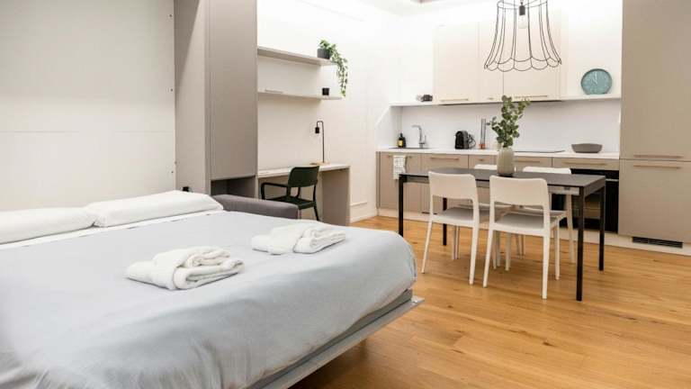 Die Ferienwohnung besteht aus einem Schlafzimmer und einem Wohnzimmer. Eine voll ausgestattete Küche mit Kühlschrank und Kaffeemaschine ist vorhanden. Zudem gibt es ein Badezimmer mit Bidet und Dusche. Handtücher und Bettwäsche werden zur Verfügung gestellt.