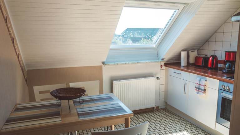 Die Ferienwohnung ist mit einer voll ausgestatteten Küche ausgestattet, die einen Kühlschrank, einen Geschirrspüler und eine Kaffeemaschine umfasst. Über zusätzliche Verpflegungsmöglichkeiten liegen keine Informationen vor.
