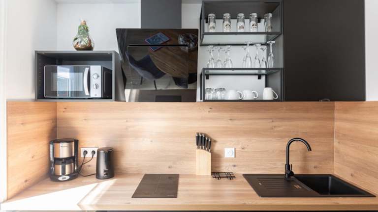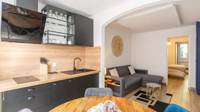 Die Ferienwohnung umfasst 1 Schlafzimmer, ein Wohnzimmer sowie eine voll ausgestattete Küche mit Kühlschrank und Wasserkocher. Ein Badezimmer mit Dusche und Haartrockner ist ebenfalls vorhanden. Handtücher und Bettwäsche werden zur Verfügung gestellt.