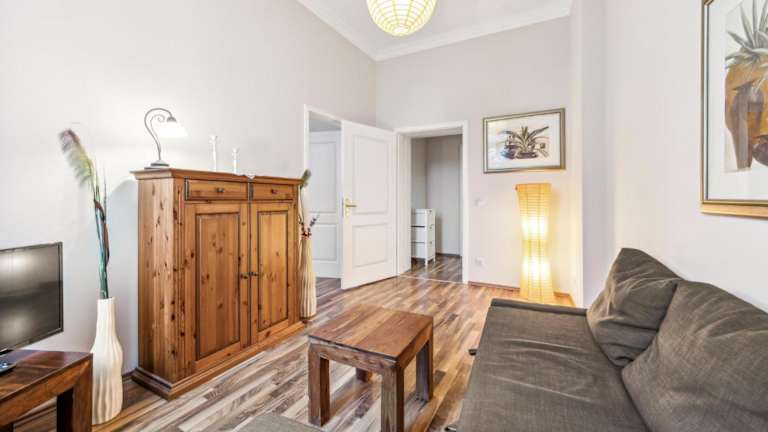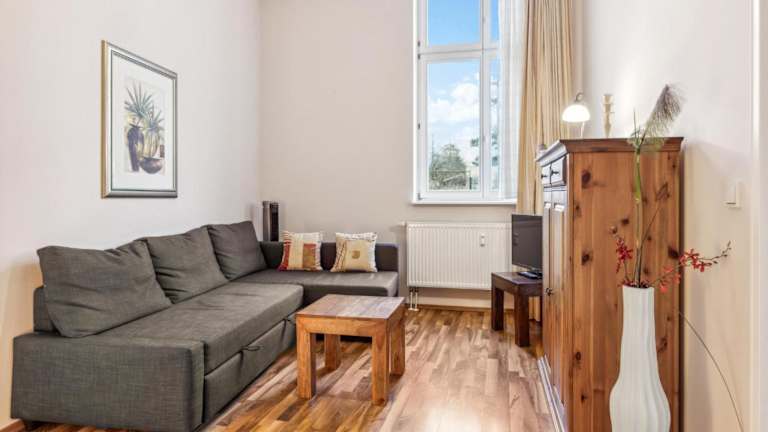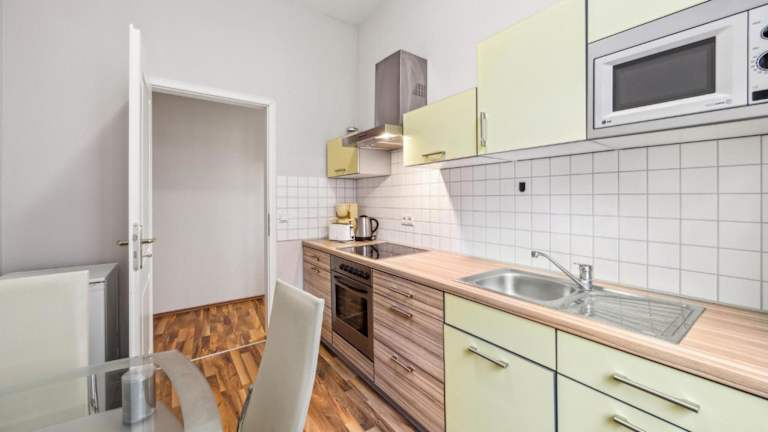 Die Ferienwohnung beinhaltet ein Schlafzimmer, eine gut ausgestattete Küche mit Kühlschrank und Mikrowelle, ein Wohnzimmer und einen TV.