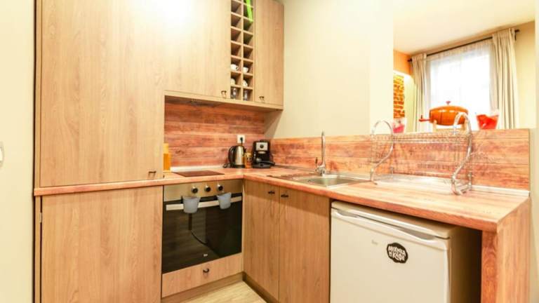Die Ferienwohnung umfasst ein Schlafzimmer, ein Wohnzimmer und eine voll ausgestattete Küchenzeile mit Kühlschrank und Kaffeemaschine. Zudem gibt es ein Badezimmer mit Dusche und Haartrockner. Handtücher und Bettwäsche werden bereitgestellt.