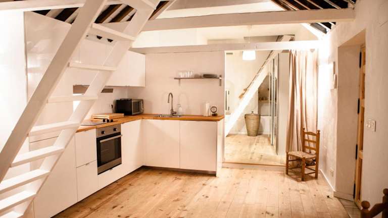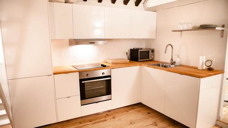 Die Ferienwohnung umfasst eine Terrasse, ein Schlafzimmer, ein Wohnzimmer und eine gut ausgestattete Küche, die mit einem Kühlschrank und einem Geschirrspüler ausgestattet ist. Handtücher und Bettwäsche werden bereitgestellt.