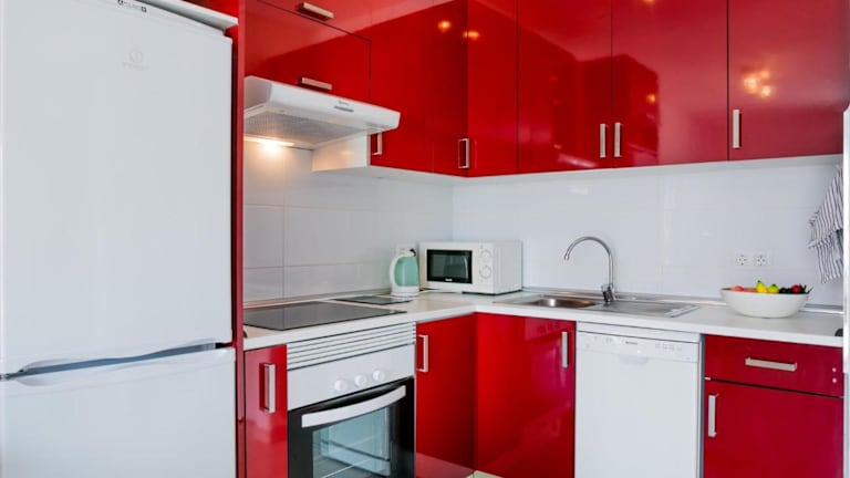 Die gut ausgestattete Küche verfügt über einen Kühlschrank und einen Geschirrspüler, um die Zubereitung von Mahlzeiten zu erleichtern.