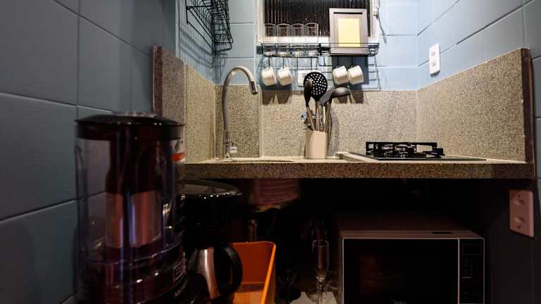 Die Unterkunft 1Qto com Vista Lateral do Mar | PI 134/904 bietet eine Ferienwohnung mit Klimaanlage. Sie verfügt über einen Essbereich sowie eine Küche, die mit einem Kühlschrank und einer Mikrowelle ausgestattet ist. Handtücher und Bettwäsche werden zur Verfügung gestellt.