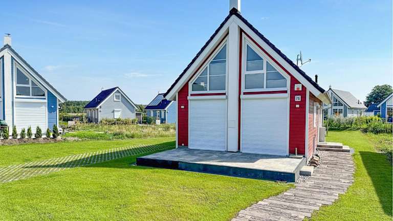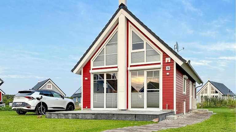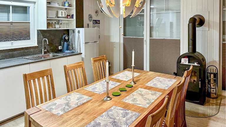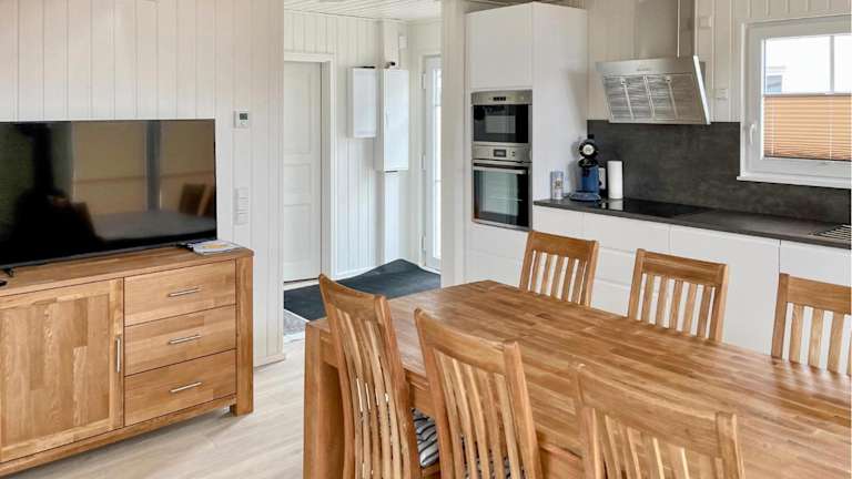 Das Ferienhaus bietet 2 Schlafzimmer, ein einladendes Wohnzimmer und eine voll ausgestattete Küche, die unter anderem einen Kühlschrank und einen Geschirrspüler umfasst.