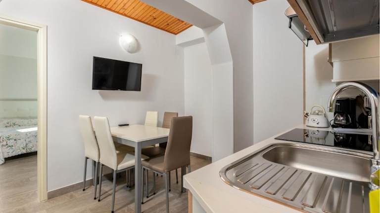 Die Ferienwohnung verfügt über zwei Schlafzimmer, ein Wohnzimmer sowie eine gut ausgestattete Küche mit Kühlschrank und Ofen. Ein Balkon lädt zum Entspannen ein, während ein Flachbild-TV für Unterhaltung sorgt.