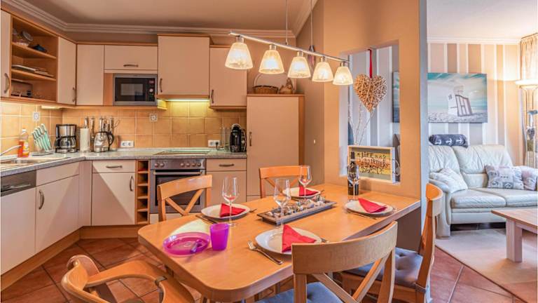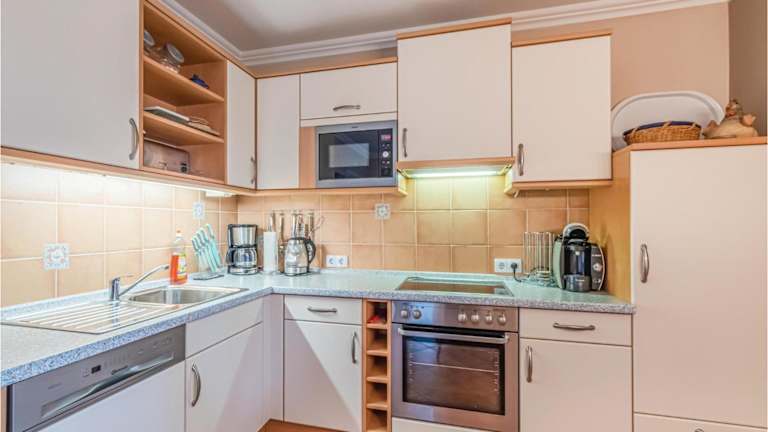 Die Ferienwohnung verfügt über eine voll ausgestattete Küche mit einem Kühlschrank, Geschirrspüler, Waschmaschine, Ofen und Mikrowelle, die den Gästen selbständige Verpflegungsmöglichkeiten bietet.