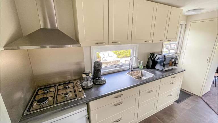 Das Ferienhaus verfügt über eine voll ausgestattete Küche mit Kühlschrank, Kaffeemaschine und Mikrowelle, welche eine selbstständige Verpflegung ermöglicht. Es gibt keine spezifischen Informationen zu weiteren Essensmöglichkeiten vor Ort.
