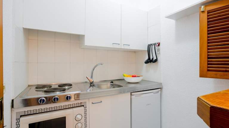 Die Ferienwohnung verfügt über einen Essbereich sowie eine Küche mit Kühlschrank, in der Gäste ihre eigenen Mahlzeiten zubereiten können. Es sind keine Verpflegungsmöglichkeiten durch das Hotel angegeben.