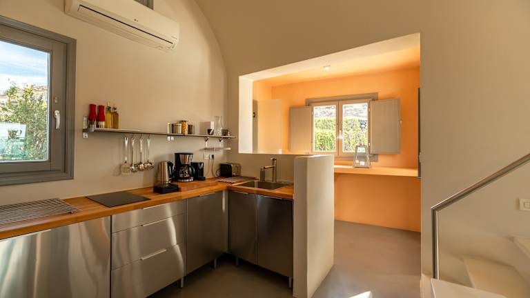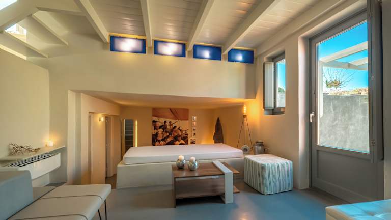 Die klimatisierten Villen verfügen über separate Schlafzimmer mit eigenem Bad. Ausgestattet mit einem Wohnzimmer, in dem eingebaute Sofas, ein Flachbild-Sat-TV, ein DVD-Player und eine iPod-Dockingstation vorhanden sind, bieten sie viel Platz zur Entspannung. Die Bäder sind mit Hydromassageduschen oder Whirlpool-Badewannen ausgestattet und jede Villa hat eine eigene Terrasse mit Blick auf die Caldera und den berühmten Sonnenuntergang.