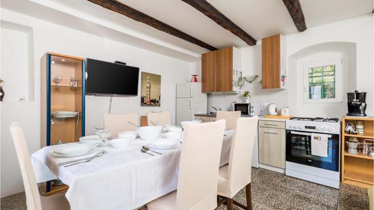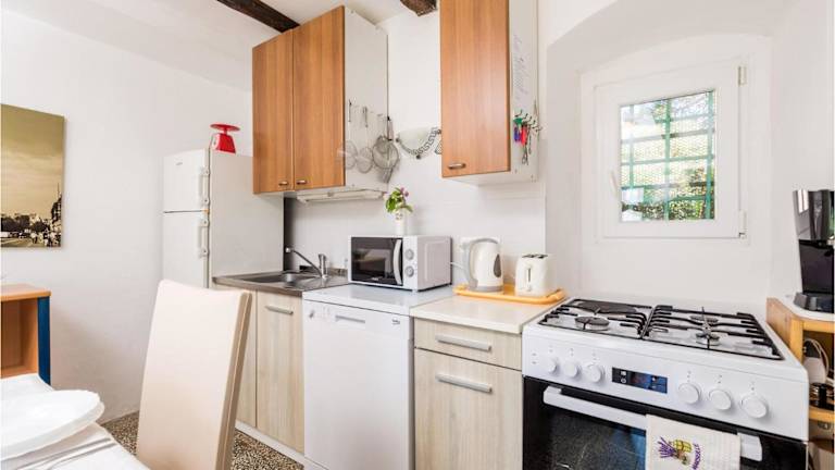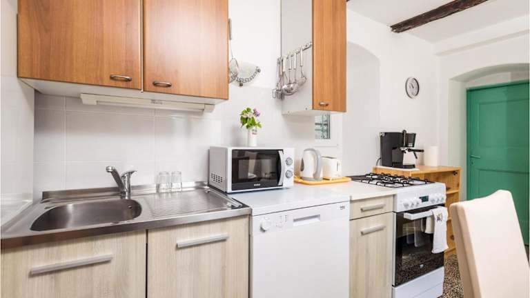 Die voll ausgestattete Küche umfasst einen Kühlschrank, Geschirrspüler, Waschmaschine, Ofen und Mikrowelle, sodass Gäste sich Shus ein heimeliges Essen zubereiten können.