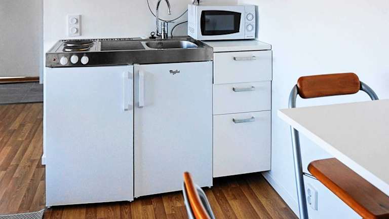 Das Ferienhaus ist mit einer voll ausgestatteten Küche eingerichtet, die einen Kühlschrank und eine Mikrowelle umfasst. Informationen zur Verpflegung werden nicht bereitgestellt.