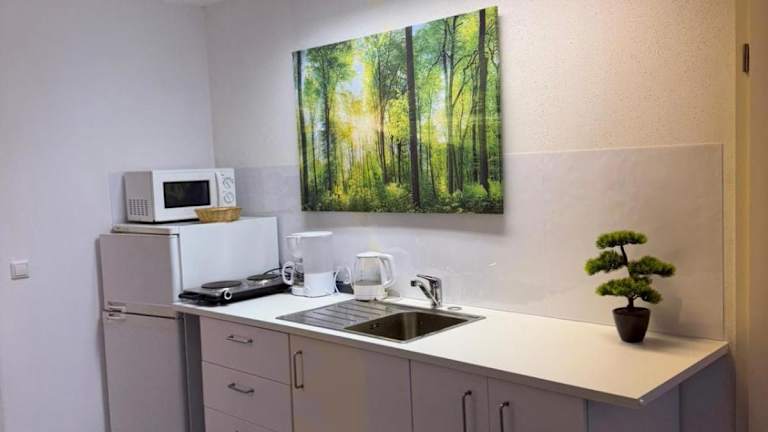 Die Ferienwohnung bietet ein Schlafzimmer, eine Küchenzeile mit Kühlschrank und Mikrowelle sowie ein Badezimmer mit Dusche und Haartrockner. Handtücher und Bettwäsche werden zur Verfügung gestellt. Zusätzlich sind Nichtraucherzimmer und Familienzimmer vorhanden.