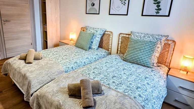 Diese Ferienwohnung hat eine Fläche von 50m² und besteht aus einem Schlafzimmer, einem Wohnzimmer sowie einer voll ausgestatteten Küche mit Kühlschrank und Kaffeemaschine. Das Badezimmer verfügt über eine Dusche und einen Haartrockner. Handtücher und Bettwäsche werden zur Verfügung gestellt. Die Unterkunft bietet Bequemlichkeit und Privatsphäre.