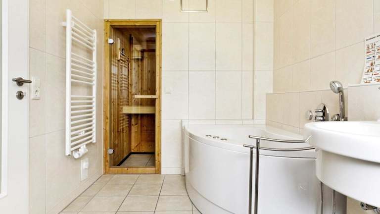 Die Unterkunft bietet Platz für bis zu 6 Personen und hat 2 Schlafzimmer. Die Küche ist mit einem Kühlschrank und einem Geschirrspüler ausgestattet. Das Badezimmer verfügt über eine Badewanne oder Dusche. Zusätzlich steht Gästen eine Sauna zur Verfügung.