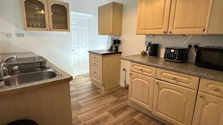 Die Unterkunft besteht aus drei Schlafzimmern, einem gemütlichen Wohnzimmer und einer voll ausgestatteten Küche, die für die Zubereitung von eigenen Mahlzeiten einlädt. Ein Badezimmer steht den Gästen ebenfalls zur Verfügung.
