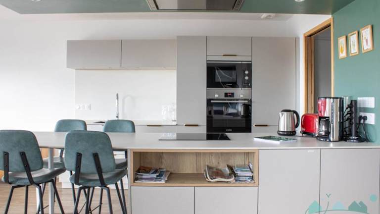 Die Unterkunft ist mit einer modernen Küchenzeile ausgestattet, die einen Kühlschrank, einen Geschirrspüler, einen Ofen und eine Kaffeemaschine umfasst, was die Zubereitung von Mahlzeiten erleichtert.