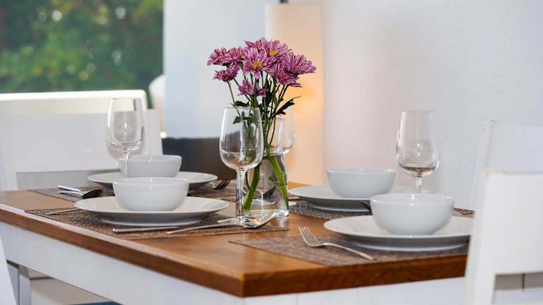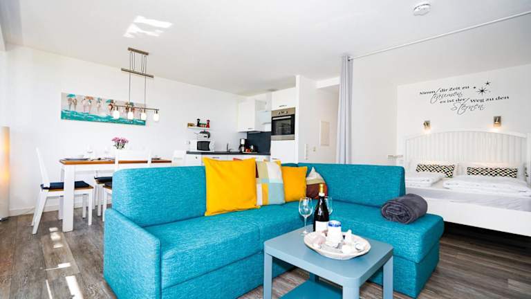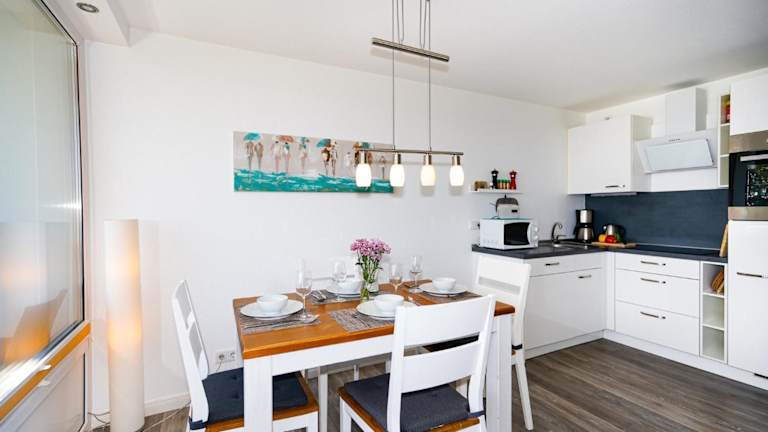 Die Ferienwohnung verfügt über 1 Schlafzimmer, ein Wohnzimmer und ein Badezimmer mit Dusche. Zur Ausstattung gehören ein Flachbild-TV sowie eine gut ausgestattete Küche mit Kühlschrank und Geschirrspüler. Handtücher und Bettwäsche können gegen Aufpreis bereitgestellt werden.