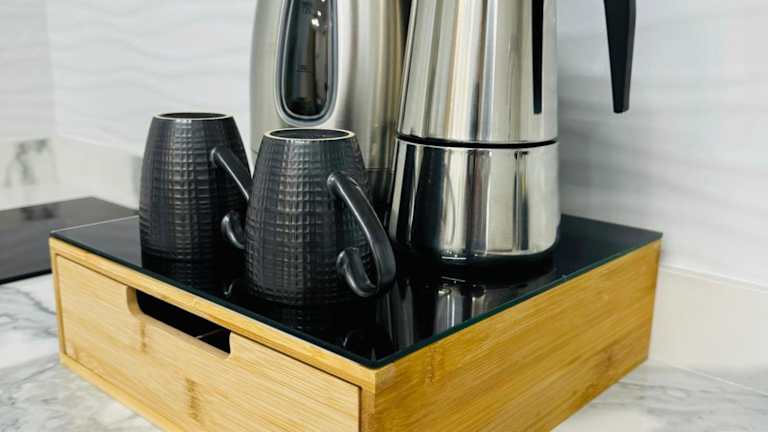 Die Ferienwohnung beinhaltet eine komplett ausgestattete Küche mit einer Mikrowelle, sodass die Gäste自己 das Essen zubereiten können. Ein Essbereich steht ebenfalls zur Verfügung. Es sind keine Informationen zu weiteren Verpflegungsmöglichkeiten vorhanden.