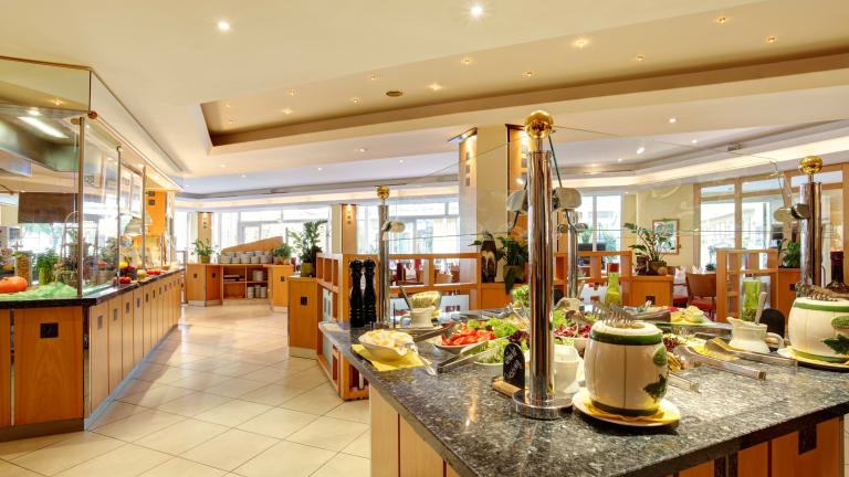 Das Verpflegungsangebot von der offenen Showküche umfasst: Halbpension, Vollpension, Frühstück, Brunch, Mittagessen oder Abendessen. Deutsche und internationale Spezialitäten finden Sie im Restaurant des Hauses. Außerdem bietet das Menü vegetarische,diabetiker Spezialitäten.