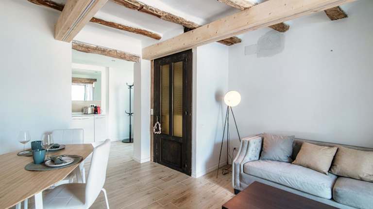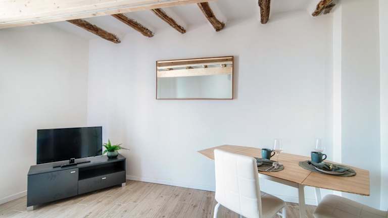 Die Ferienwohnung besteht aus einem Schlafzimmer, einem Wohnzimmer sowie einer voll ausgestatteten Küche mit Kühlschrank und Kaffeemaschine. Zudem steht ein Badezimmer mit Bidet und Dusche zur Verfügung. Handtücher und Bettwäsche werden bereitgestellt.