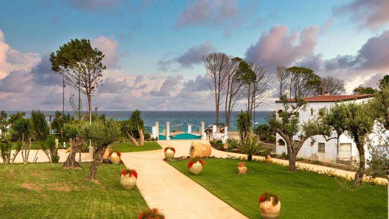 Die Unterkunft Acquamarina, appartamenti sul mare con piscina bietet eine heimelige Atmosphäre mit einem Pool, einem Garten sowie einer Terrasse mit Blick auf die Berge.