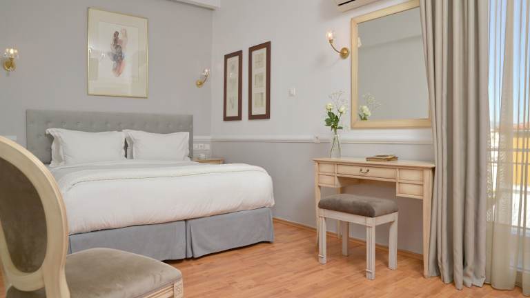 Die klimatisierten Zimmer des Hotels sind stilvoll und klassisch dekoriert. Sie sind geräumig und mit ökologischen Matratzen sowie einem Flachbild-TV ausgestattet. Einige Zimmer bieten Balkone mit Blick auf die Akropolis. Alle Zimmer verfügen über eine zentrale Heizung, einen Safe, eine Minibar und WiFi ohne Zusatzkosten. Die Badezimmer sind mit Kosmetikartikeln ausgestattet und bieten zusätzliche Annehmlichkeiten wie Hausschuhe.