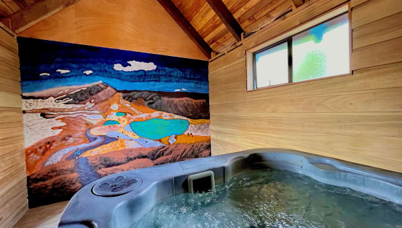 Nach einem langen Tag auf dem Wanderweg Tongariro Alpine Crossing können Gäste im Whirlpool entspannen. Ein Transfer zum/vom Wanderweg kann gegen Aufpreis gebucht werden.