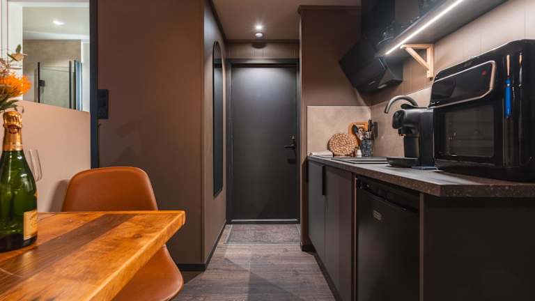 Die Wohneinheiten sind mit einer Küchenzeile ausgestattet, die über einen Kühlschrank, einen Geschirrspüler und einen Ofen verfügt.