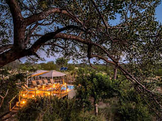 Der im Landhausstil gestaltete Campingplatz Africa on Foot bietet reetgedeckte Chalets, eine Bar sowie eine Aussichtsterrasse mit einem Planschbecken und Sonnenliegen. Der rustikale Charme wird durch den Loungebereich unter einem alten Baumstamm ergänzt, der zum Entspannen einlädt.