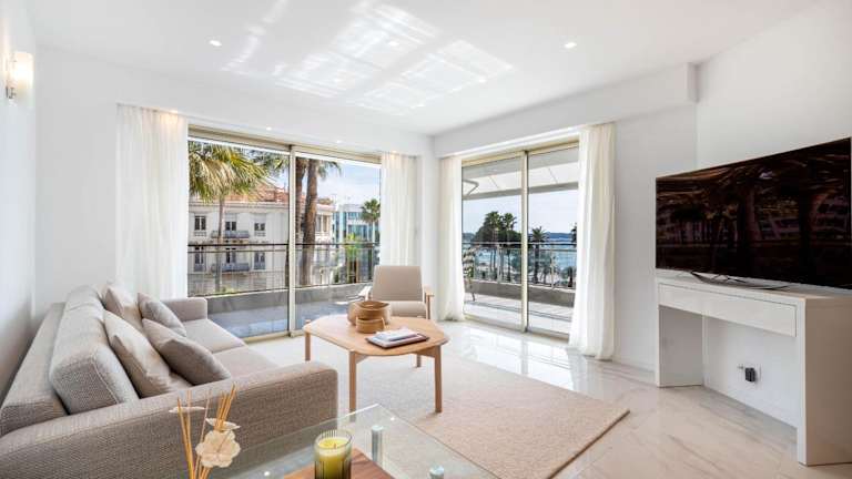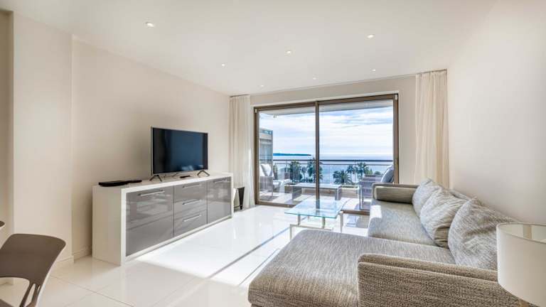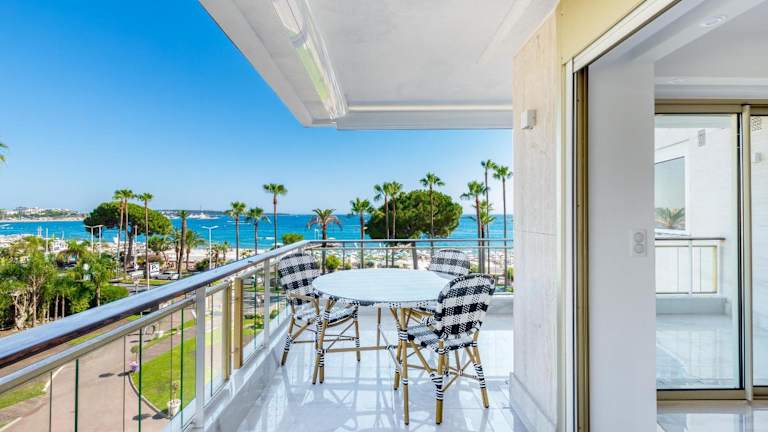 Die Agence des Résidences - Appartements privés du 45 CROISETTE - Prestige bietet klimatisierte Übernachtungsmöglichkeiten in einer zentralen Lage in Cannes. Die Unterkunft verfügt über eine Terrasse mit Meerblick und einen einladenden Sitzbereich.