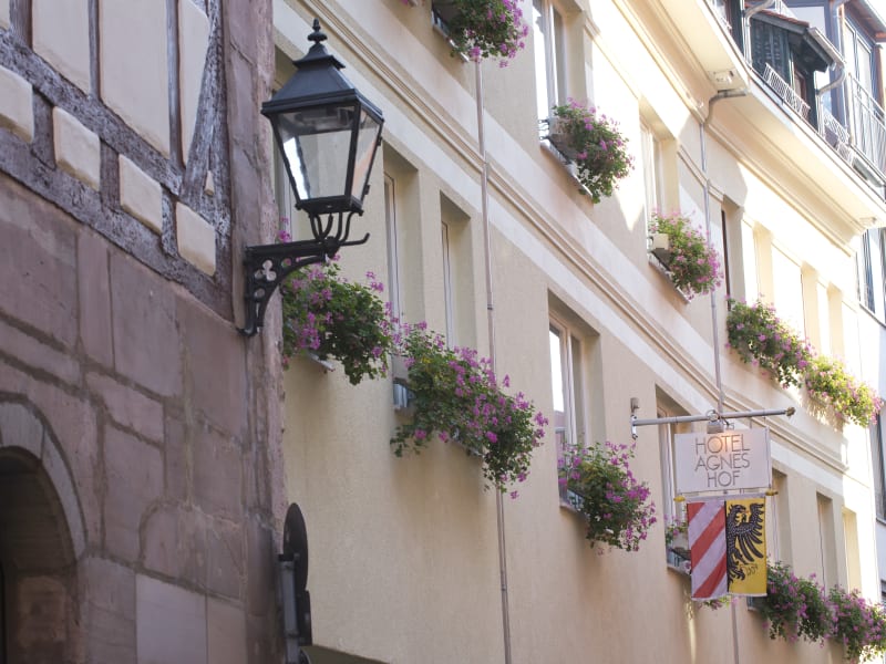Kleines Stadthotel mit charmantem Flair mitten in der malerischen Altstadt von Nürnberg. Das Hotel Agneshof liegt ruhig und versteckt in der Agnesgasse, zwischen Sebaldkirche und Kaiserburg, im am besten erhaltenen Viertel der historischen Innenstadt. Ausstattung 74 Zimmer, davon 1 Suite mit Dachterrasse Frühstücksrestaurant Lobbybar Grüner Innenhof mit Garten und Liegewiese 2 Tagungsräume Tiefgarage mit 20 PKW-Stellplätzen* *Maximale Durchfahrtshöhe 1,50 m. Für Vans, Jeeps und Autos mit 5,00 m Länge ist unsere Tiefgarage nicht geeignet.