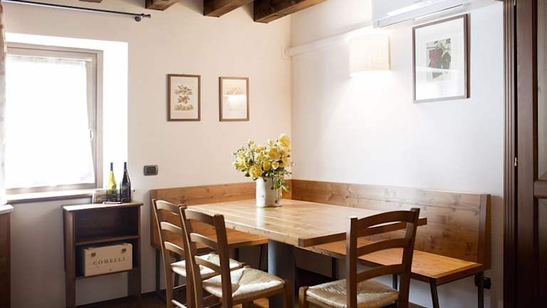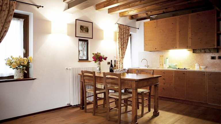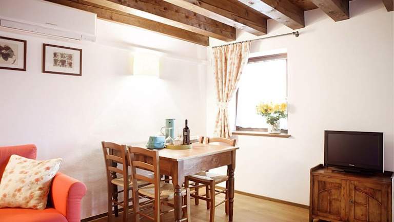 Die Zimmer sind im rustikalen Stil eingerichtet und umfassen eine voll ausgestattete Küchenzeile, einen Balkon mit Blick sowie modernsten Annehmlichkeiten wie Klimaanlage und Internetzugang. Jedes Zimmer verfügt über ein eigenes Badezimmer mit Dusche und Haartrockner. Die Ausstattung umfasst auch Holzmobiliar und Balkendecken, was zur heimeligen Atmosphäre beiträgt.