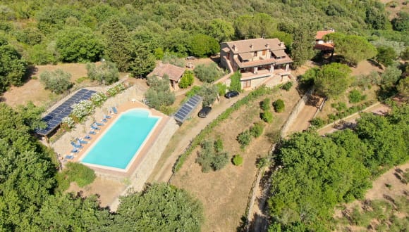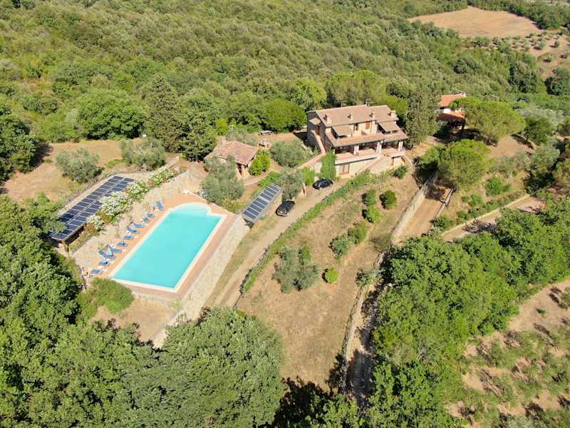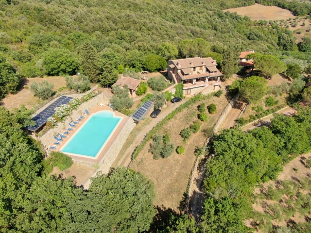 Wir befinden uns zwischen Punta Ala und Massa Marittima, in panoramischer Hügelalage. Um uns herum nur Wald und Olivenbäume, davor die Felder und der Blick auf das Meer, das in 15 Minuten erreichbar ist.