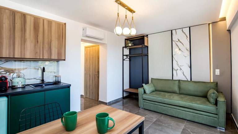 Die Wohneinheiten der Unterkunft sind ausgestattet mit einem Sitzbereich, einem Kabel Flachbild-TV und einer voll ausgestatteten Küche, die einen Kühlschrank und eine Herdplatte umfasst. Jedes eigene Badezimmer verfügt über eine Dusche und kostenlose Pflegeprodukte. Einige Wohneinheiten bieten zusätzlich einen Balkon und/oder eine Veranda mit Meerblick.