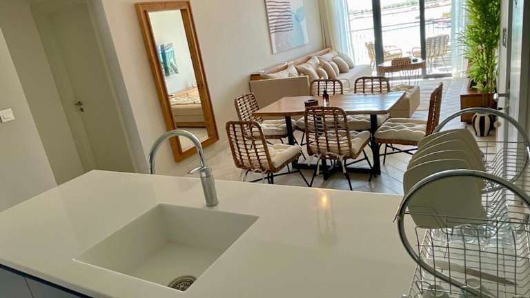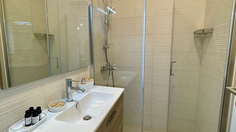 Die Ferienwohnung umfasst zwei Schlafzimmer, ein Wohnzimmer sowie eine voll ausgestattete Küchenzeile mit Kühlschrank und Kaffeemaschine. Es gibt drei Badezimmer mit Bidet und Dusche. Handtücher und Bettwäsche werden bereitgestellt. Weiterhin stehen schallisolierte Zimmer und eine Sonnenterrasse zur Verfügung.
