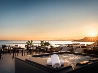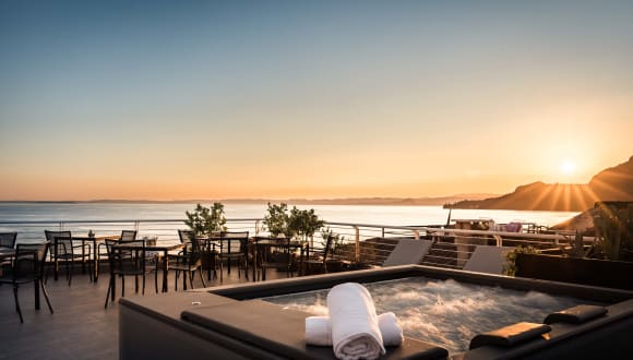 Im vierten Stock des Hotels haben wir einen privilegierten Raum geschaffen: eine herrliche Panoramaterrasse mit aromatischen Pflanzen, Hydromassage-Pool, Liegestühlen, Stühlen und Tischen, wo Sie eine Pause einlegen, wundervolle Fotos machen oder in völliger Entspannung einen Aperitif genießen können. Bademäntel und Badetücher werden Ihnen von unserem Personal zur Verfügung gestellt.