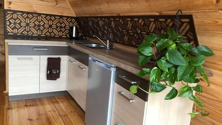 Das Ferienhaus bietet ein Schlafzimmer, ein Wohnzimmer sowie eine gut ausgestattete Küchenzeile mit Kühlschrank und Mikrowelle. Handtücher und Bettwäsche werden bereitgestellt. Eine Terrasse ist ebenfalls vorhanden.