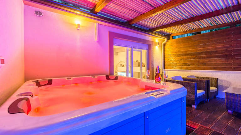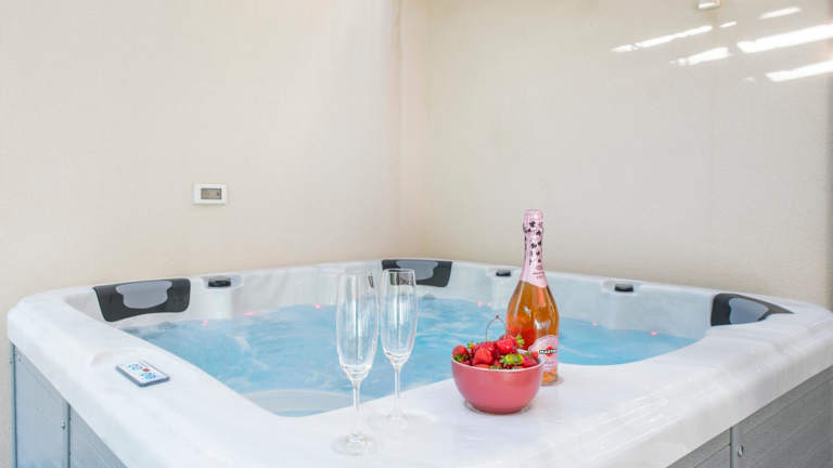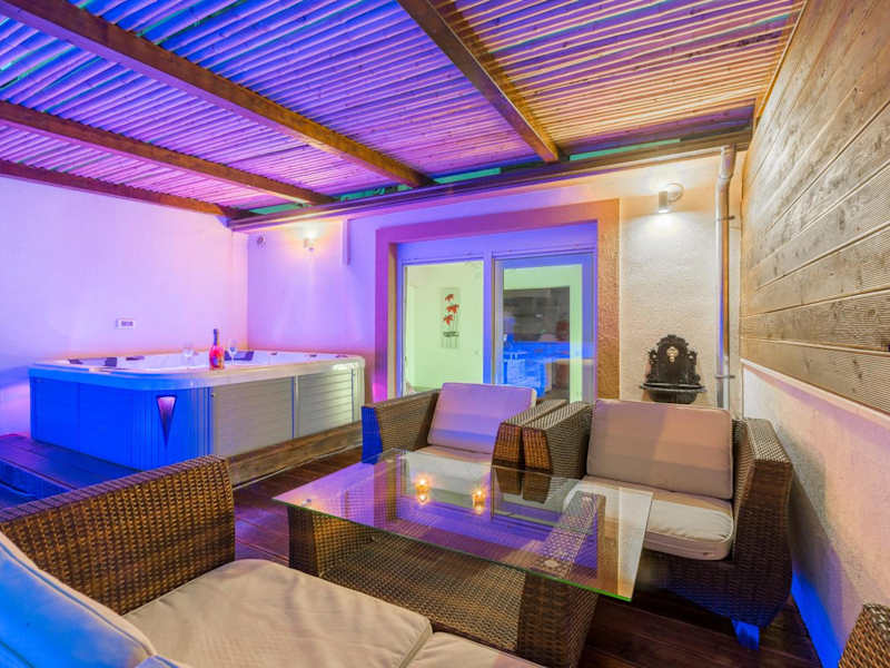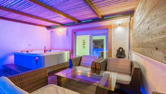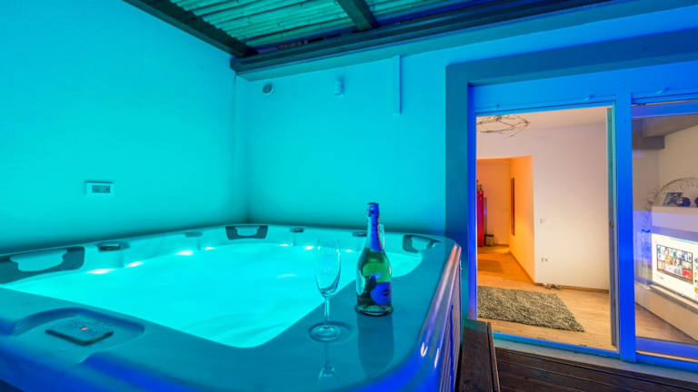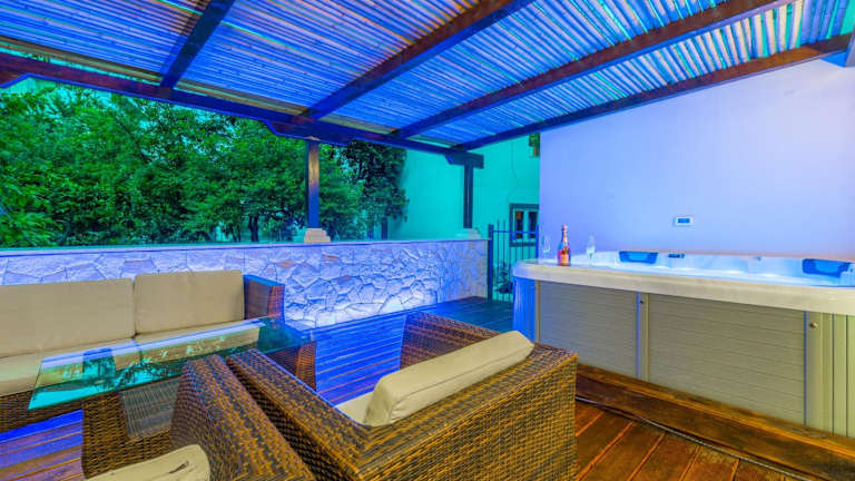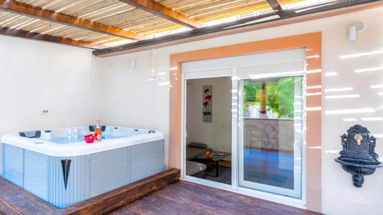 Alena with jacuzzi apartment bietet eine heimelige Ferienwohnung mit Zugang zu einer Gemeinschaftslounge, einer Terrasse und einer Gemeinschaftsküche. Die Unterkunft ist von einem Garten umgeben und verfügt über einen eigenen Pool sowie Grillmöglichkeiten.