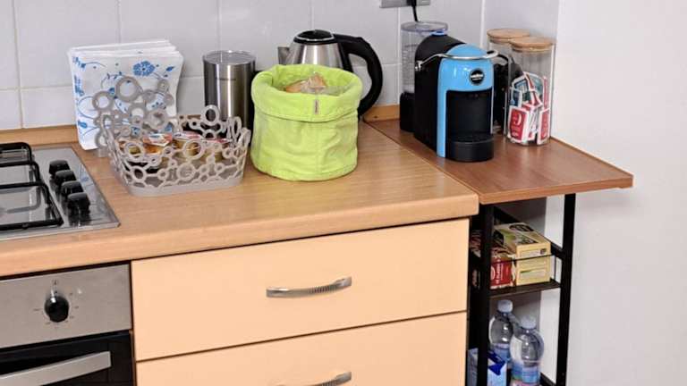 In der Ferienwohnung steht eine voll ausgestattete Küche zur Verfügung, die unter anderem mit einem Kühlschrank und einer Kaffeemaschine ausgestattet ist. Verpflegungsmöglichkeiten sind in der Umgebung zu finden.
