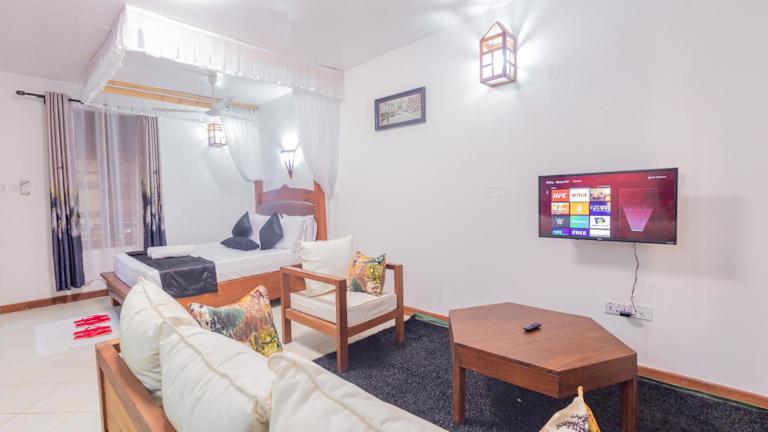 Die Unterkunft Almasi befindet sich in Ukunda und liegt nur 1,3 km vom Strand Diani Beach sowie 1,9 km vom Leisure Lodge Golf Club entfernt. Colobus Conservation liegt in einer Distanz von 10 km und der Kaya Kinondo Sacred Forest ist 15 km entfernt. Der nächste Flughafen, der Flughafen Ukunda, ist 5 km von der Unterkunft entfernt.