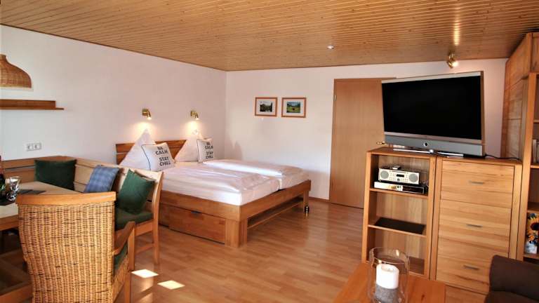 Die Ferienwohnung umfasst 1 Schlafzimmer, eine voll ausgestattete Küche mit Kühlschrank und Mikrowelle sowie einen Sitzbereich. Das Badezimmer ist mit einer Dusche eingerichtet.