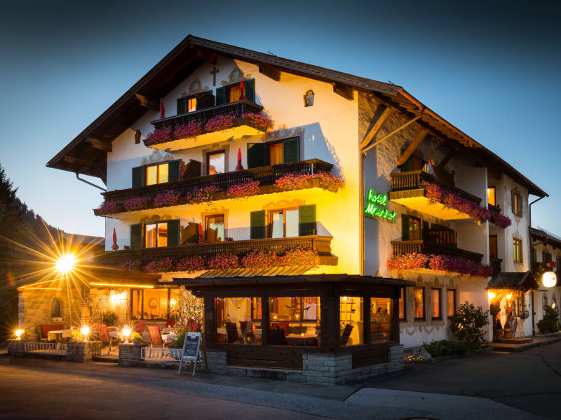Gemütliches, kleines Hotel mit herzlicher und familiärer Atmosphäre. Herrlicher Blick von fast allen Zimmern auf das Karwendel, Wetterstein- oder Estergebirge. Von den Alpspitz- und Zugspitzzimmern wunderbarer Blick auf Zug- und Alspitze. Alle Zimmer sind entweder komplett aus Zirbenholz oder haben einen Zirbenholzanteil. Das Restaurant dient auch als Aufenthaltsraum. Das Kachelofenstüberl als Fernsehraum. Wir bieten von Donnerstag bis Montag eine Brotzeit in Büffetform zur Selbstbedienung an, teilweise zusätzlich Kaffee und Kuchen. Die Brotzeit variiert im Winter von hausgemachten Suppen, Eintöpfen, bayerischen Mehlspeisen bis Schöpfgerichten und im Sommer zusätzlich von kalten Brotzeiten über verschiedene Salate bis zu gemütlichen Grillabenden auf der Panoramaterrasse. Am Dienstag bereiten wir ein kleines Kuchenbüffet mit hausgemachten Kuchen ab 16 Uhr vor. Kaffee und Tee zur Selbstbedienung. Am Mittwoch ist Ruhetag. Das Restaurant ist trotzdem für Getränke zur Selbstbedienung und zum Aufenthalt geöffnet. Das Restaurant kann den ganzen Tag ab 14 Uhr als Aufenthaltsraum genutzt werden mit dem Kachelofenstüberl als Fernsehraum. Getränke stehen zum Verzehr und zur Selbstbedienung zur Verfügung. Gerne können Sie sich auch von den umliegenden Restaurants etwas bestellen und im Restaurant/Aufenthaltsraum verzehren. Direkt am Hotel Bushaltestelle und kostenlose Parkplätze. Das Wander- und Loipennetz der Alpenwelt Karwendel führt direkt am Hotel vorbei, also idealer Einstieg.