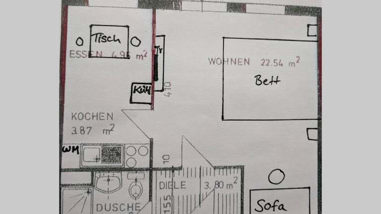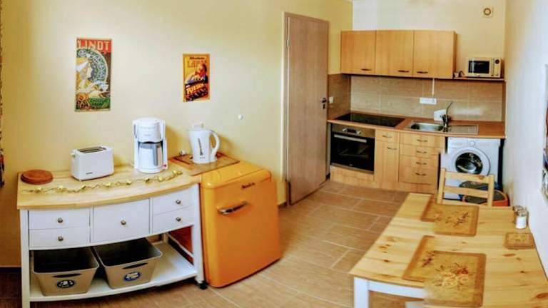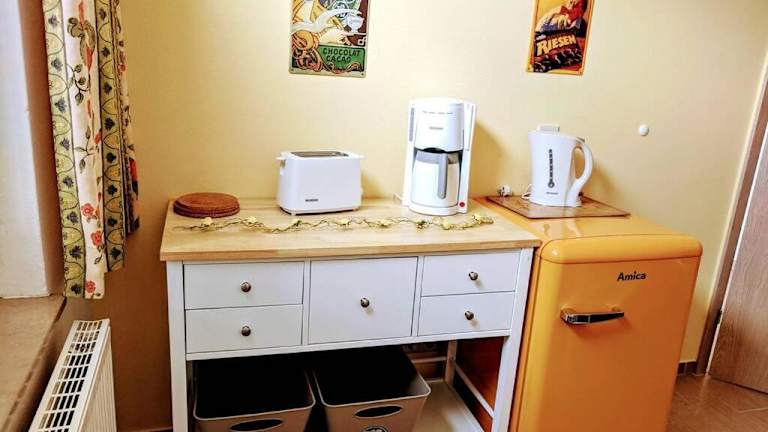 Die Ferienwohnung verfügt über ein Schlafzimmer, eine voll ausgestattete Küche mit Kühlschrank und Geschirrspüler sowie ein Badezimmer mit Dusche und Haartrockner. Handtücher und Bettwäsche werden zur Verfügung gestellt.