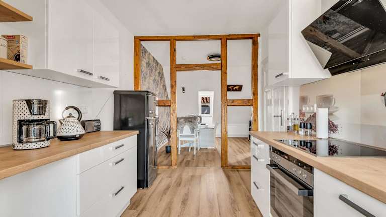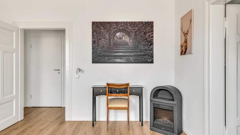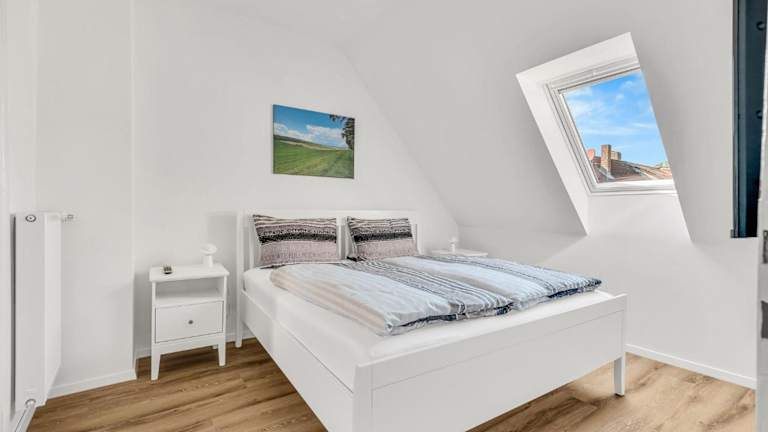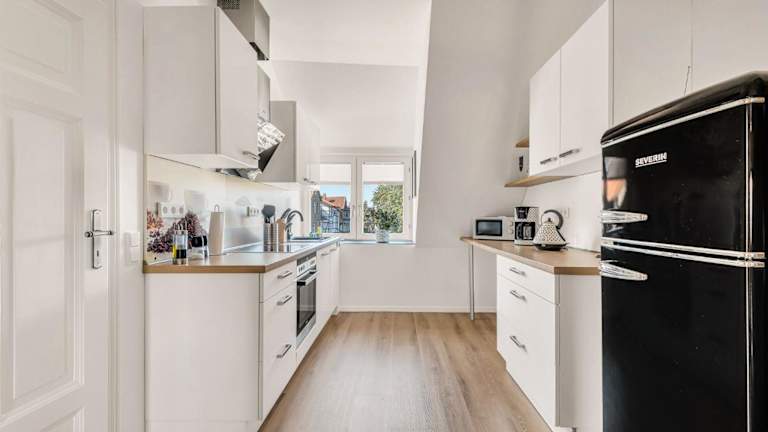 Die Ferienwohnung umfasst ein Schlafzimmer, ein Wohnzimmer sowie eine voll ausgestattete Küche mit Kühlschrank und Kaffeemaschine. Das Badezimmer ist mit einer Dusche und einem Haartrockner ausgestattet. Handtücher und Bettwäsche werden bereitgestellt.